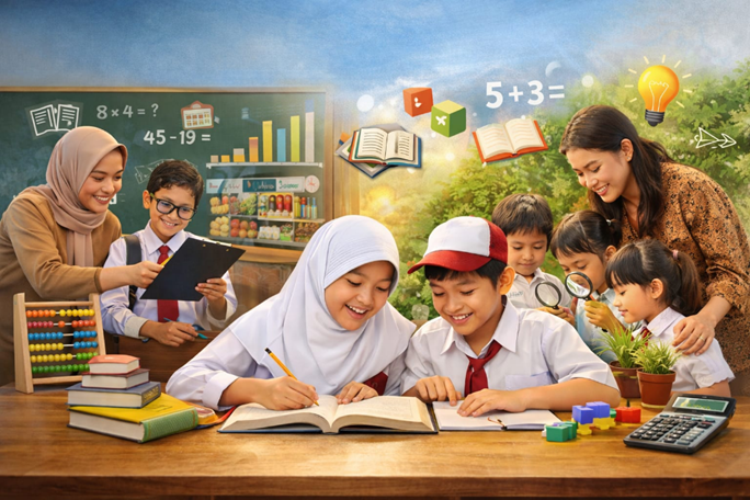 Dalam praktiknya, pembelajaran tematik memungkinkan integrasi literasi dan numerasi secara alami. Misalnya, pada tema “Kegiatan Ekonomi”, siswa membaca teks tentang aktivitas jual beli di pasar (literasi), kemudian melakukan simulasi menghitung total harga barang atau menyusun laporan sederhana dalam bentuk tabel (numerasi).